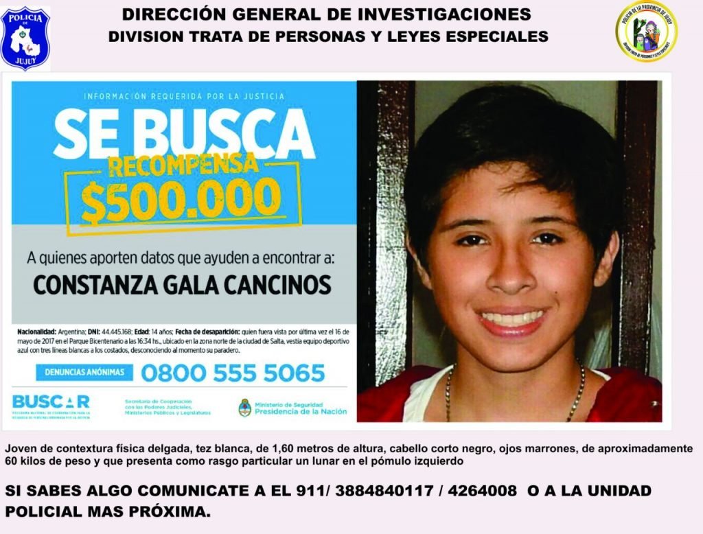La División Trata de Personas y Leyes Especiales de la Policía de Jujuy, está buscando a una menor identificada como Constanza Gala Cancinos, de 14 años de edad, con domicilio en la provincia de Salta. Se ausenta de su hogar desde el pasado 16 de mayo del corriente año. Ofrecen una recompensa