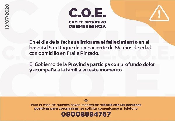 El Comité Operativo de Emergencias informó hace instantes que hay una nueva víctima fatal por el Sars Covid-19 en la provincia. Se trata de un hombre de 64 años, oriundo de Fraile Pintado. Es el cuarto fallecimiento que tiene la localidad de la región este de la provincia.