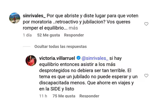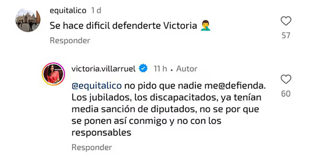 El intercambio de Villarruel en su cuenta oficial de Instagram se dio horas después de que el Senado aprobara leyes que ponen en aprietos al Gobierno en términos fiscales como el incremento en las jubilaciones.