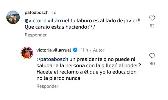 Además, otro usuario de la red social le reprochó a Villarruel “que su laburo es al lado” del presidente Javier Milei a lo que respondió: “¿Un presidente que no puede ni saludar a la persona con la que llegó al poder? Hacele el reclamo a él, yo a la educación no la pierdo nunca”.